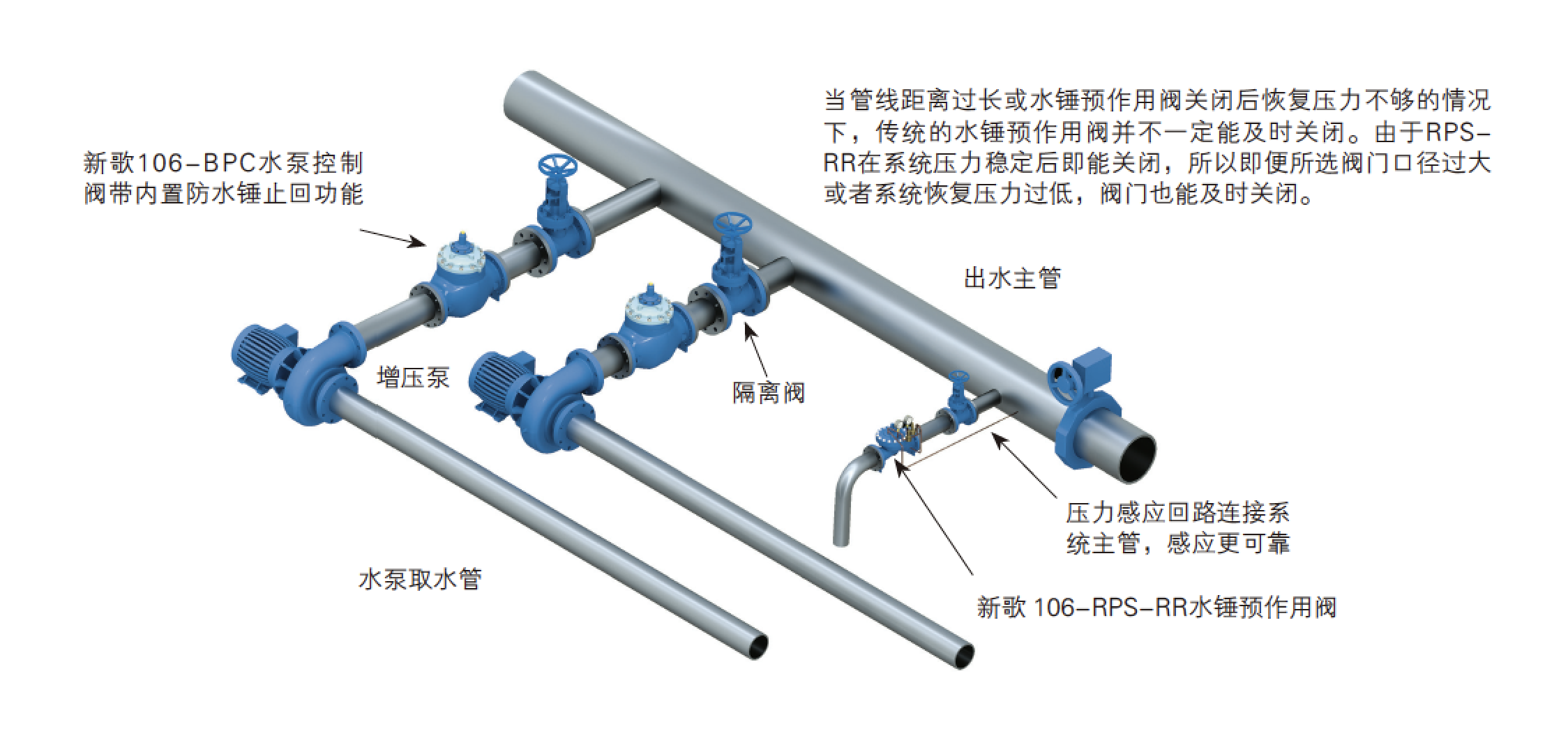 RPS-RR型阀门在感应到系统压力出现异常变化也就是感应到水锤来临时迅速开启。此阀门配置了两套导阀感应回路,每套导阀通过感应回路连接到水泵后端的连通管道上。其中,81-RP型高压导阀在感应到系统压力超过正常设定值时迅速开启,排放过高的压力;而81-RPD型压差导阀则感应主阀隔膜两边的压差。由于该导阀感应到的是连通管及阀门之间的压差而低压通常是发生在水锤发生的最初阶段,所以在高压水锤来临前,阀门有足够的时间预开启,从而消除系统由突然断电而产生的水锤。