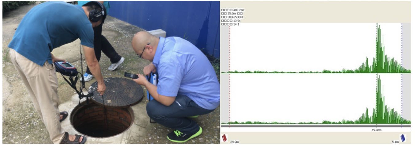 通过噪声记录仪回传的数据显示,初步判定有4条管道范围存在漏失点。为准确确认漏点具体位置,项目人员利用听漏仪和相关仪对这4条管道范围开展漏失点相关定位工作。在现场排查过程中发现,在疑似漏失点管道范围内有一排水井中有较为清晰的流水声音,但打开井盖后,通过水质检测并未发现自来水痕迹,通过相关仪的相关结果显示漏点恰好位于排水井附近。水司对该漏失点进行开挖和修复工作,发现噪声数据与现场判断一致,年节水1万立方米。
