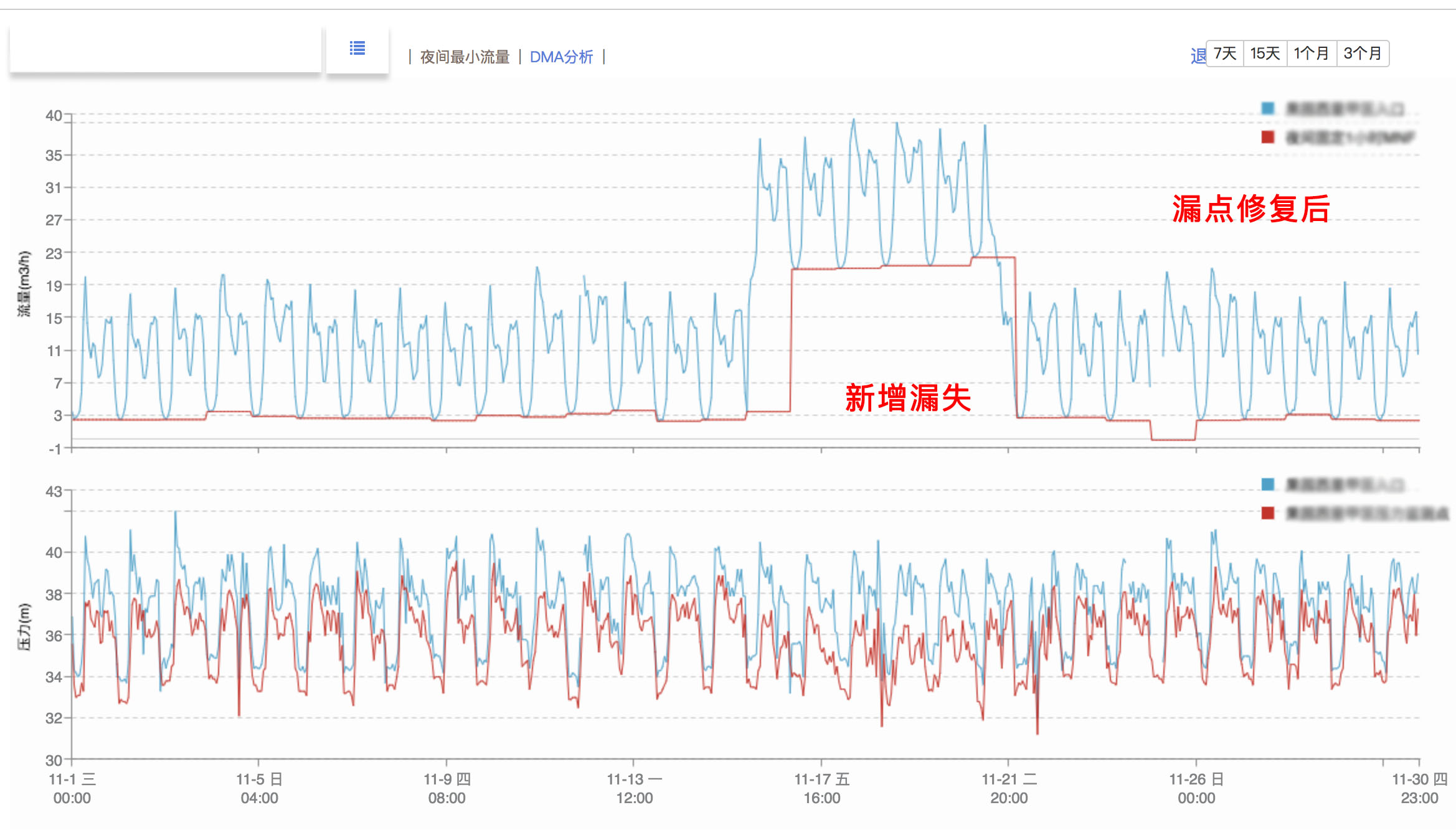 2017年11月,LeakView®系统显示该区域内的夜间流量明显上升至21.4 立方米/时,监测点压力与入水口压力差值增大,日水量突增至700 立方米/天,综合管网基础信息、压力监测设备数据以及机器学习能力等信息,LeakView®系统迅速对流量情况发出新增漏失报警,以派发工单的形式告知并建议对相关区域进行漏点普查工作。在示范区内的某单位门口发现一处漏点,通过修复工作,区域恢复到之前运行水平,年节水17万立方米