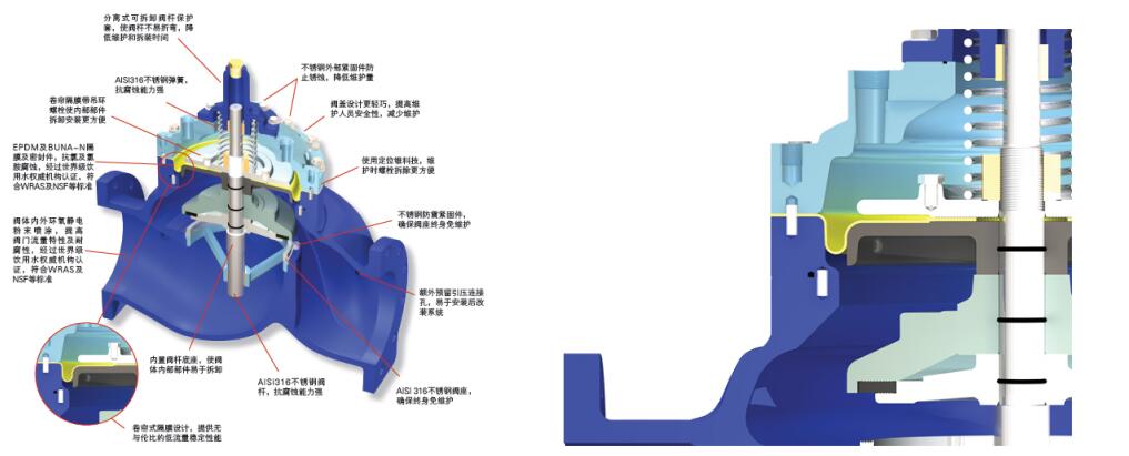 卷帘式隔膜,控制过程稳定 上下控制腔水流相互作用,控制过程更精确 |